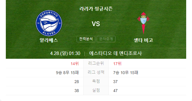 4월 28일 해외축구 알라베스 VS 셀타 비고 타카짱의 경기 예측 분석