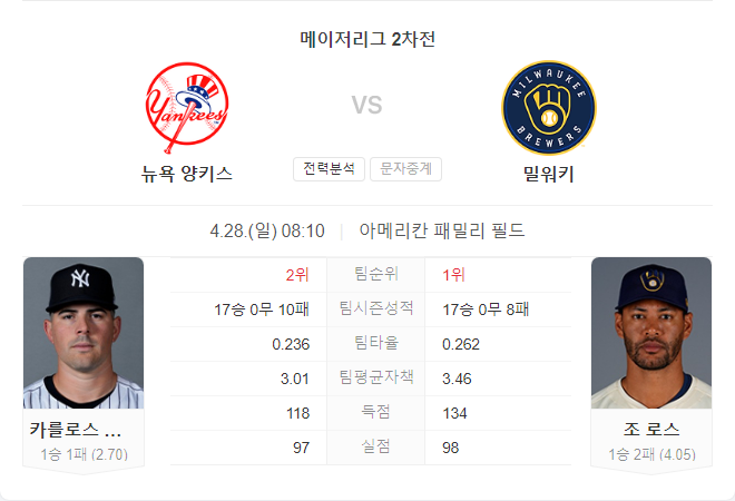 | 4월 28일 MLB 세인트루이스 카디널스 VS 뉴욕 메츠 타카짱의 경기 예측 분석 (0) | 2024.04.27 |
