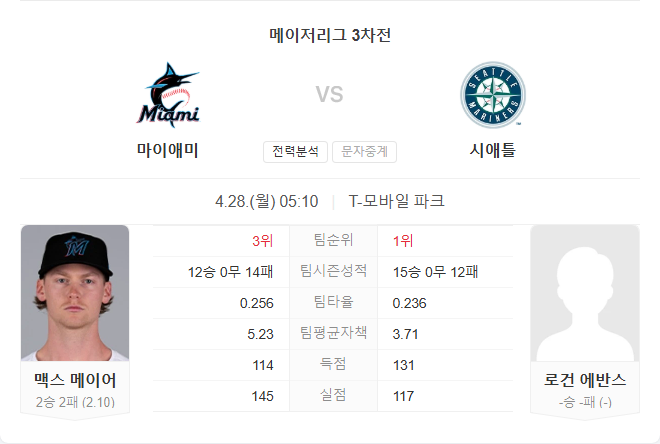선발 맥스 마이어는 시즌 2승 2패, 평균자책점 2.10을 기록하고 있습니다. 최근 경기에서는 6이닝 무실점, 14탈삼진을 기록하는 압도적인 투구를 선보였으며, 이번이 시애틀을 상대로 첫 선발 등판입니다.