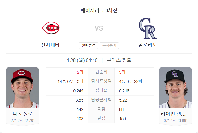신시내티 레즈는 최근 3연승을 기록하며 상승세를 타고 있습니다. 시즌 성적은 14승 13패로 내셔널리그 중부지구 2위에 올라 있으며, 상위권 도약을 노리고 있습니다. 콜로라도 로키스와의 시리즈 첫 두 경기를 모두 승리하며 스윕을 노리고 있는 상황입니다.