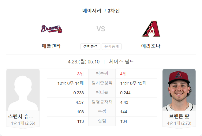 선발 스펜서 슈웰렌바흐는 시즌 1승 1패, 평균자책점 2.56을 기록하고 있습니다. WHIP 0.92로 안정적인 제구를 보이고 있으며, 최근 세인트루이스전에서 7이닝 2실점으로 호투했습니다. 팀 내 스타터 중 가장 낮은 평균자책점을 기록 중입니다.