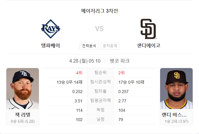 탬파베이 레이스는 잭 리텔이 완벽하진 않지만, 최근 타선 흐름과 불펜 안정성을 앞세워 경기를 유리하게 이끌 가능성이 있습니다. 파드리스 타선이 부진을 겪고 있어 초반 리드를 잡으면 무난한 운영이 기대됩니다.