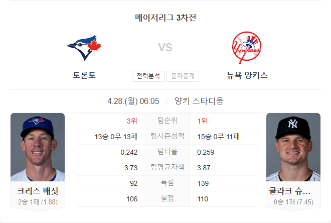 선발 크리스 배싯은 시즌 2승 1패, 평균자책점 1.88을 기록하며 팀 내 가장 안정적인 투구를 선보이고 있습니다. 28.2이닝 동안 34탈삼진, 6볼넷만을 허용하며 뛰어난 제구력을 보여주고 있으며, 지난 시즌 양키스 상대로도 좋은 기록을 남긴 바 있습니다.