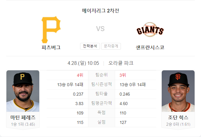 특히 피츠버그는 최근 불펜의 불안정과 집중력 저하로 인해 어려움을 겪고 있어, 이번 경기에서 샌프란시스코가 승리할 가능성이 높아 보입니다.