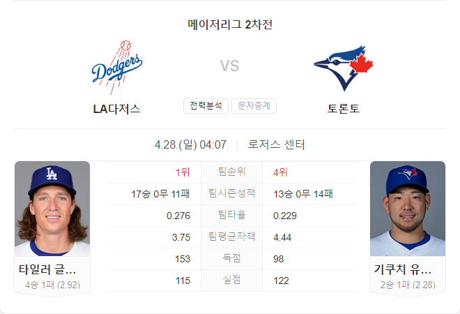 하지만 다저스의 강력한 타선과 최근의 상승세를 고려할 때, 다저스가 블루제이스를 상대로 우위를 점할 가능성이 높습니다. 경기는 접전이 될 수 있으나, 다저스가 승리할 것으로 예상됩니다.