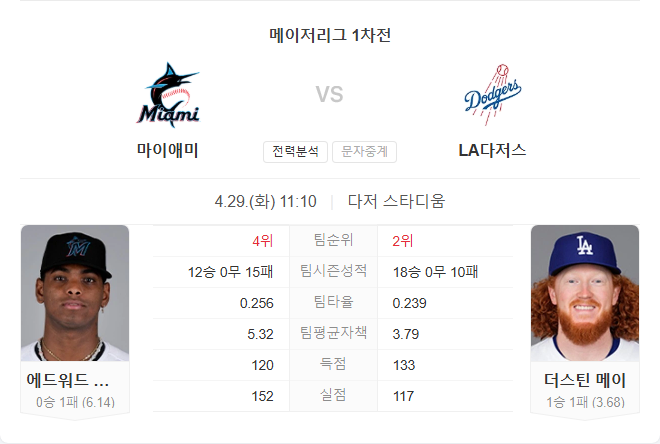 LA 다저스는 더스틴 메이가 부진했던 지난 경기 이후 반등을 노리고 있으며, 강력한 타선이 마이애미 마운드를 공략할 가능성이 큽니다. 특히 홈 경기에서의 압도적인 승률을 고려할 때 다저스가 주도권을 잡을 확률이 높습니다.