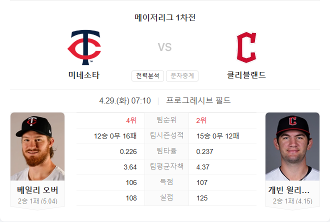 4월 29일 MLB 메이저리그 미네소타 트윈스 VS 클리블랜드 가디언스 타카짱의 경기 예측 분석