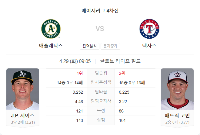 선발 패트릭 코빈은 시즌 2승 무패, 평균자책점 3.77을 기록하고 있습니다. 직전 에슬레틱스전에서는 5이닝 2실점으로 승리를 거두었으며, 시즌 전체적으로 안정적인 모습을 보여주고 있습니다. 통산 에슬레틱스 상대 2승 무패, 평균자책점 2.25로 강한 면모를 보이고 있습니다.