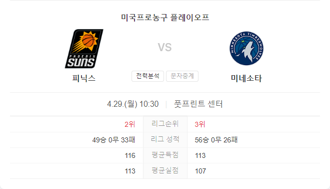 현재 기세를 보면 미네소타가 피닉스를 상대로 시리즈에서 우위를 점령하고 있으며, 미네소타의 빅맨 조합과 외곽 슈터들의 활약이 눈에 띈다. 피닉스는 공격에서 좀 더 다양성을 보여주고 리바운드 싸움에서 뒤처지지 않도록 해야 할 것이다.