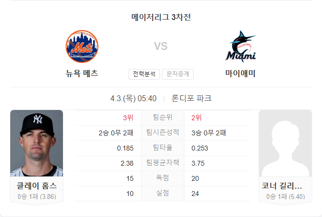 4월 3일 MLB 뉴욕 메츠 VS 마이애미 말린스 타카짱의 경기 예측 분석