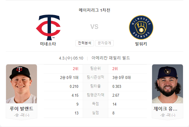 브루어스의 타선이 홈에서의 첫 경기에서도 좋은 모습을 보일 것으로 예상되며, 미네소타의 선발 투수 바란드가 이에 대응하기는 쉽지 않을 것으로 예상된다. 밀워키 브루어스의 승리를 예상한다.