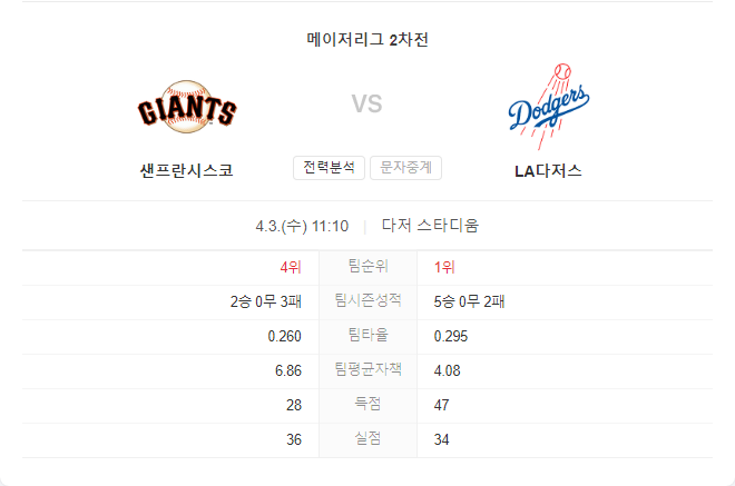 반면 다저스는 타일러 글래스노우를 선발로 내세워 자이언츠 타선을 제압하려 한다. 양 팀의 타선 모두 폭발력이 있기 때문에, 많은 득점이 예상된다. 하지만 다저스가 홈에서 더욱 강력한 모습을 보여주며 승리할 가능성이 높다고 본다.