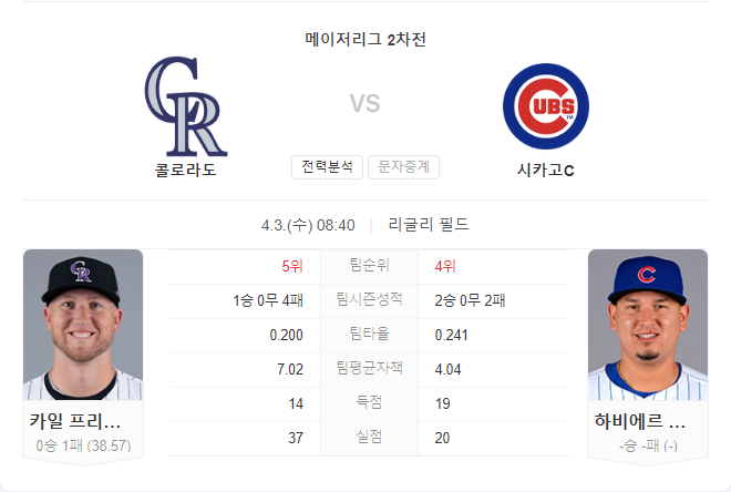 로키스의 초기 부진과 컵스의 최근 상승세를 고려할 때, 이번 경기는 컵스가 유리한 고지를 점할 가능성이 높아 보인다. 특히, 로키스의 선발 투수 프리랜드가 지난 경기에서 보여준 부진한 모습이 이번 경기에서도 이어질 경우, 컵스의 강력한 타선이 이를 적극적으로 공략할 것으로 예상된다.