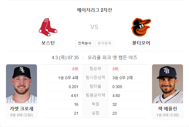 보스턴은 연패를 끊기 위해 크로셰에게 기대를 걸고 있으나, 현재 타선 흐름이 매우 저조한 반면 볼티모어는 멀린스를 중심으로 한 중심 타선이 뜨겁게 타오르고 있습니다. 에플린이 안정적인 피칭을 이어간다면, 홈 팀 볼티모어가 연승을 이어갈 가능성이 높아 보입니다.