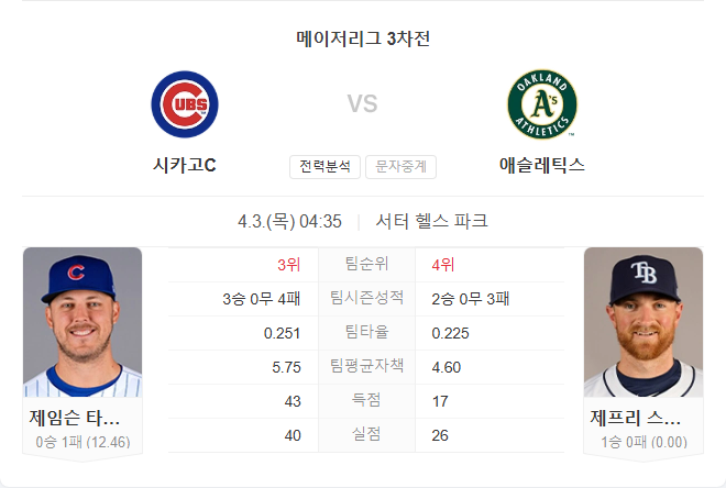 4월 3일 MLB LA 에인절스 VS 세인트루이스 카디널스 타카짱의 경기 예측 분석 (0) | 2025.04.02 |