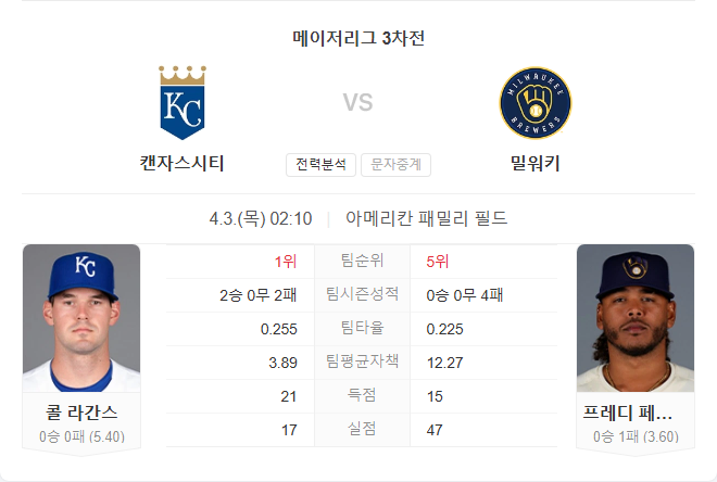 캔자스시티는 지난 시즌부터 이어진 안정적인 선발 로테이션과 폭발력 있는 타선을 바탕으로 시리즈 흐름을 쥐고 있습니다. 반면, 밀워키는 에이스 페랄타가 등판하지만 타선의 부진과 불안한 불펜 운영이 변수로 작용할 수 있습니다. 라건스가 초반 실점을 최소화한다면 로열스가 기세를 이어갈 가능성이 높습니다.
