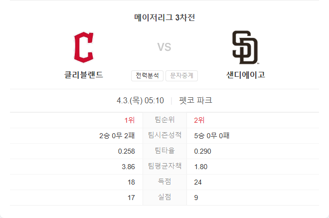 클리블랜드는 전체적으로 타격과 수비 모두에서 불안한 흐름을 보이고 있으며, 벤 라이블리의 안정감 있는 피칭에도 불구하고 타선의 지원이 부족합니다. 반면 샌디에이고는 연승 기세에 타선과 마운드 모두가 조화를 이루며 리그 최상위 전력을 보여주고 있습니다.
