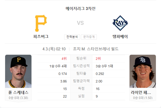 반면 탬파베이는 꾸준한 공격 흐름과 안정된 마운드를 바탕으로 홈에서 강한 면모를 보이고 있어 우세한 경기를 펼칠 가능성이 높습니다. 특히 페피엇의 제구와 탈삼진 능력은 피츠버그의 부진한 타선을 상대하기에 충분해 보입니다. 전체적으로 탬파베이의 우세가 점쳐지는 경기입니다.