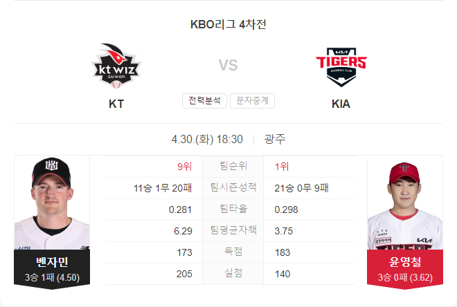 KT 위즈는 대패 후 분위기 전환을 위해 웨스 벤자민을 선발로 등판시킵니다. 벤자민은 최근 한화와의 홈 경기에서 8이닝 1실점으로 승리를 거두며, 4월 한 달간 3승 0.96이라는 인상적인 성적을 남겼습니다.
