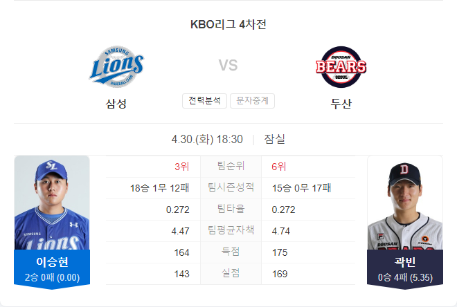 두산 베어스는 곽빈이 시즌 첫 승을 위해 다시 마운드에 오릅니다. 최근 NC와의 홈 경기에서는 호투를 보였지만 승리를 거두지 못했고, 그의 기복 있는 투구가 계속되고 있습니다.