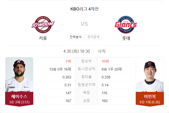 4월 30일 KBO 프로야구 키움 히어로즈 VS 롯데 자이언츠 타카짱의 경기 예측 분석