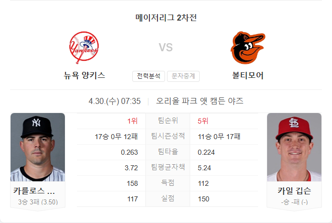 4월 30일 MLB 메이저리그 뉴욕 양키스 VS 볼티모어 오리올스 타카짱의 경기 예측 분석