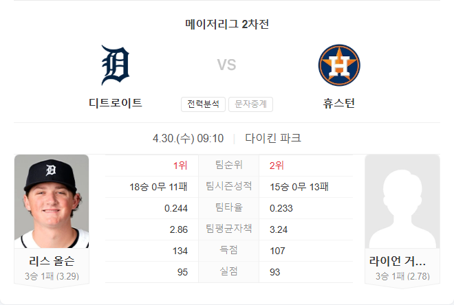 4월 30일 MLB 메이저리그 디트로이트 타이거즈 VS 휴스턴 애스트로스 타카짱의 경기 예측 분석