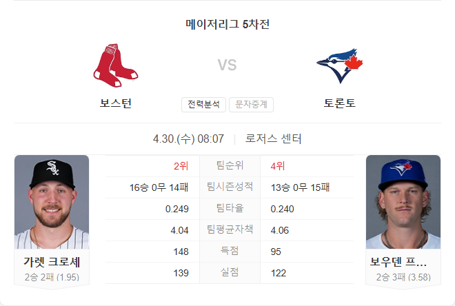 선발 가렛 크로셰는 시즌 2승 2패, 평균자책점 1.95를 기록하고 있습니다. 최근 시애틀전에서는 5이닝 4실점으로 다소 부진했지만, 토론토를 상대로는 통산 4경기에서 평균자책점 0.66을 기록하며 강한 모습을 보이고 있습니다.
