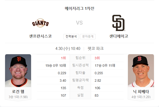 샌프란시스코 자이언츠는 로건 웹이 선발로 나서면서 초반부터 경기를 주도할 가능성이 높습니다. 타선도 최근 안정적으로 득점 기회를 살리고 있어 꾸준한 점수 생산이 기대됩니다.