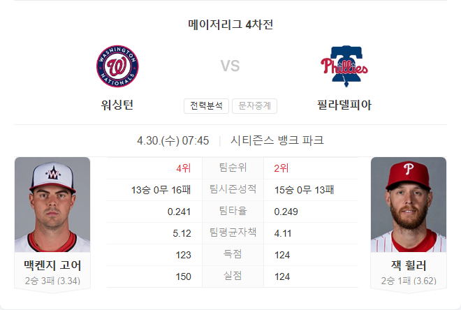 워싱턴 내셔널스는 맥켄지 고어가 좋은 투구를 이어가고 있지만, 필라델피아의 강력한 타선을 상대로 긴 이닝 소화가 쉽지 않을 전망입니다. 특히 불펜 역시 신뢰도가 떨어져 경기 후반 리스크가 존재합니다.