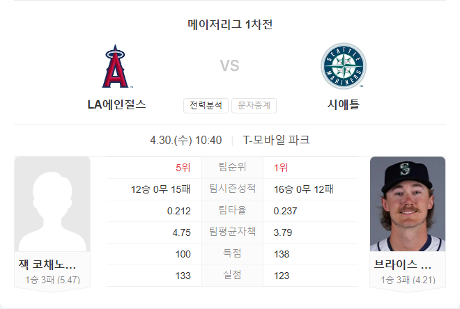 4월 30일 MLB 메이저리그 LA 에인절스 VS 시애틀 매리너스 타카짱의 경기 예측 분석