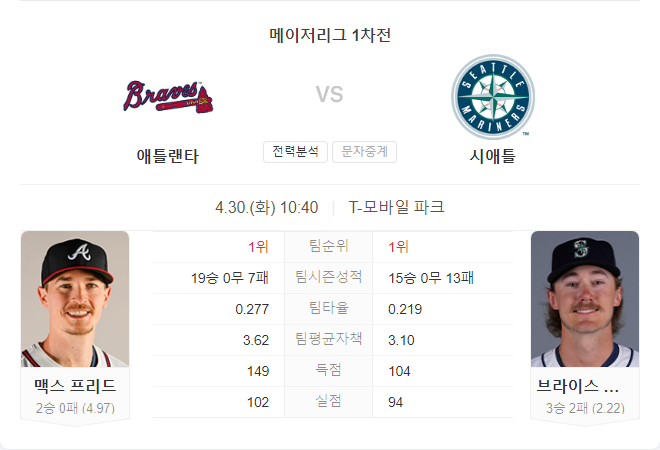 4월 30일 MLB 애틀랜타 브레이브스 VS 시애틀 매리너스 타카짱의 경기 예측 분석