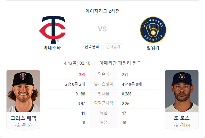 미네소타 트윈스는 초기 타선의 부진에도 불구하고 밀워키와의 시리즈에서 분위기 전환을 노린다. 반면, 밀워키 브루어스는 초반 4연승으로 좋은 출발을 보이고 있으며, 조 로스의 복귀가 이번 경기에서 어떤 영향을 줄지 주목된다.