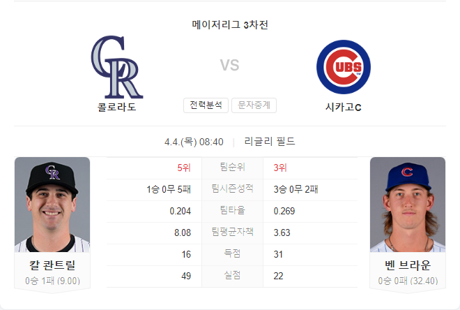 콜로라도 로키스는 현재 1승 4패로 시즌 초반 어려움을 겪고 있다. 애리조나를 상대로 한 승리 이후 2연패를 기록 중이며, 이번 시리즈 마지막 경기에서 시카고 컵스를 상대로 패배의 연속을 끊고자 한다. 로키스는 평균 2.80득점을 기록하고 있으며, 타율 .200으로 리그 24위, 출루율 .259로 27위, 장타율 .306으로 25위를 기록하고 있다.