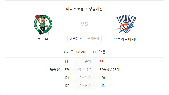 4월 4일 NBA 오클라호마시티 썬더 VS 보스턴 셀틱스 경기 예측