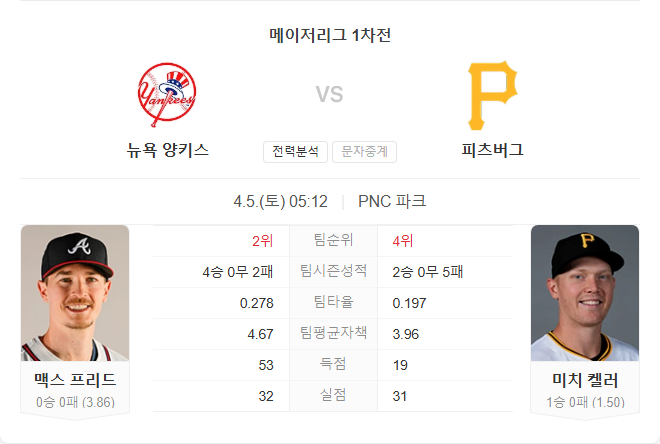 선발 투수는 우완 미치 켈러로, 시즌 첫 경기에서 6이닝 1실점으로 안정적인 피칭을 보여주었습니다. 지난 시즌 4.25 ERA를 기록한 켈러가 강타선의 양키스를 상대로도 견고한 피칭을 이어갈 수 있을지가 관건입니다.