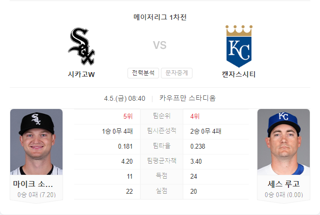 시카고 화이트삭스는 AL 중부 지구의 라이벌인 캔자스시티 로얄스와의 4경기 시리즈를 시작하기 위해 원정길에 오른다. 화이트삭스는 시즌 초반 1-4로 출발해 이미 -11의 득점 마진을 기록 중이다. 딜런 시즈와 같은 에이스 투수를 봄 훈련 기간에 트레이드한 것을 포함하여 팀의 주요 부분들을 재건하기 위한 명확한 의도를 보여주었다.