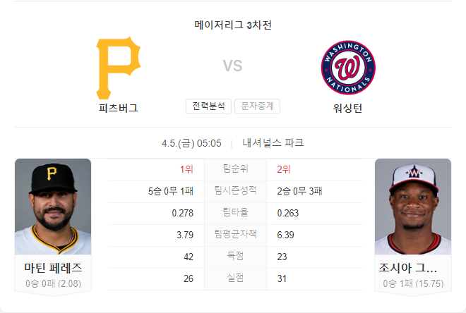 반면, 워싱턴 내셔널스는 조시아 그레이가 시즌 첫 등판에서 보여준 부진을 만회하고 팀의 첫 승리를 견인할 수 있을지 주목된다. 두 팀의 현재 폼과 맞대결 이력을 고려했을 때, 이번 경기는 피츠버그 파이어리츠가 우위를 점할 것으로 예상된다.