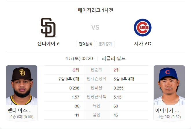 4월 5일 MLB 샌디에이고 파드리스 VS 시카고 컵스 타카짱의 경기 예측 분석