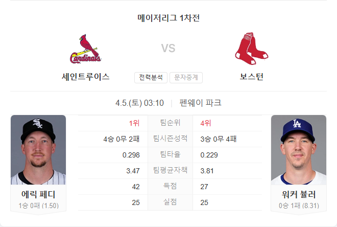 세인트루이스는 타선의 집중력과 출루 능력에서 확실한 우위를 점하고 있으며, 페디의 최근 투구 내용도 안정적입니다. 반면 보스턴은 홈 개막전이라는 분위기 상승 요소는 있으나, 타선 침묵과 선발 뷸러의 불안정한 투구가 변수로 작용할 수 있습니다. 전반적으로 최근 타격 흐름과 선발 매치업을 고려할 때 세인트루이스가 유리한 흐름을 가져갈 가능성이 높습니다.