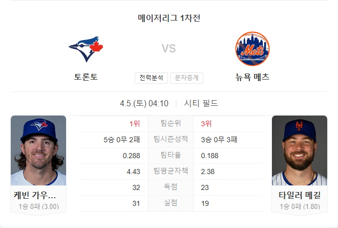 반면, 메츠는 홈 개막전이라는 이점을 안고 있지만, 타일러 메길이 토론토의 폭발적인 타선을 얼마나 억제할 수 있을지가 변수입니다. 양 팀 모두 선발진의 초반 흐름이 좋지만, 타격 컨디션과 최근 흐름을 종합하면 토론토의 근소한 우세가 예상됩니다.