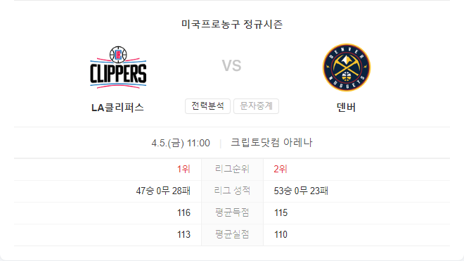 정규 시즌의 마지막 단계에 접어들면서, 이 경기들은 또한 플레이오프를 위한 최종 준비 작업입니다. 덴버 너겟츠는 홈코트 이점을 보장하는 1위를 목표로 하고 있으며, 그 목표를 달성하기 위해서는 이러한 경기에서 승리해야 합니다. 따라서, 현 서부 컨퍼런스의 최고 팀이자 현 챔피언인 덴버 너겟츠가 자신들의 위치에 걸맞는 경기를 펼칠 것으로 기대됩니다.