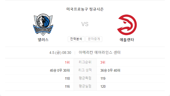 4월 5일 NBA 애틀란타 호크스 VS 달라스 매버릭스 경기 예측