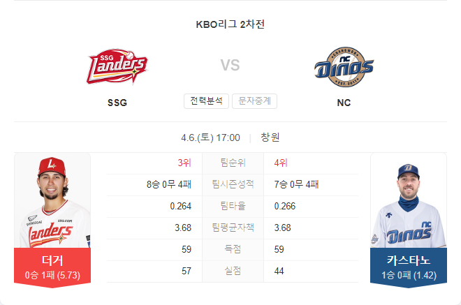 4월 6일 KBO 프로야구 SSG 랜더스 VS NC 다이노스 경기 예측