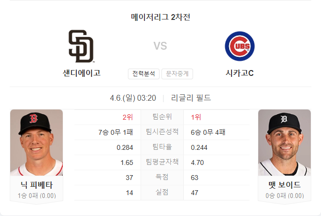 샌디에이고는 개막 이후 뛰어난 마운드 운용으로 안정적인 승리를 이어왔습니다. 비록 전날 패배를 당했지만, 닉 피베타의 상승세를 고려하면 다시 분위기 반전을 노릴 수 있는 기회입니다. 반면 시카고는 타선이 매우 강력하지만 불펜의 불안정이 변수로 작용할 수 있습니다. 양 팀 모두 선발진은 안정감을 보이지만, 전체적인 마운드 운영에서는 샌디에이고가 한 수 위입니다.