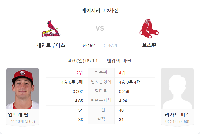 4월 6일 MLB 메이저리그 세인트루이스 카디널스 VS 보스턴 레드삭스 타카짱의 경기 예측 분석