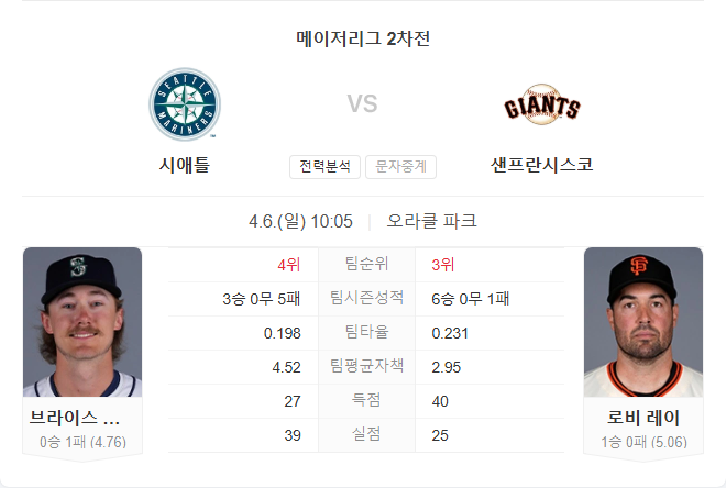 양 팀 모두 타선에서는 고전하고 있지만, 투수진에서는 안정감을 보이고 있습니다. 매리너스의 브라이스 밀러는 지난 시즌 안정적인 피칭을 선보였고, 자이언츠의 로비 레이는 부상 복귀 이후 확실한 위력을 입증하고 있습니다.