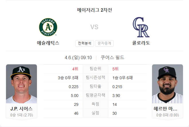 하지만 홈 구장인 쿠어스 필드는 타자 친화적 환경으로, 한 방 싸움으로 흐를 가능성도 배제할 수 없습니다. 전반적으로 투수진이 더 안정적인 애슬레틱스가 근소 우세를 점할 것으로 예상됩니다.