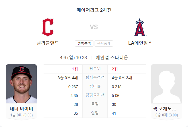 4월 6일 MLB 메이저리그 클리블랜드 가디언스 VS LA 에인절스 타카짱의 경기 예측 분석