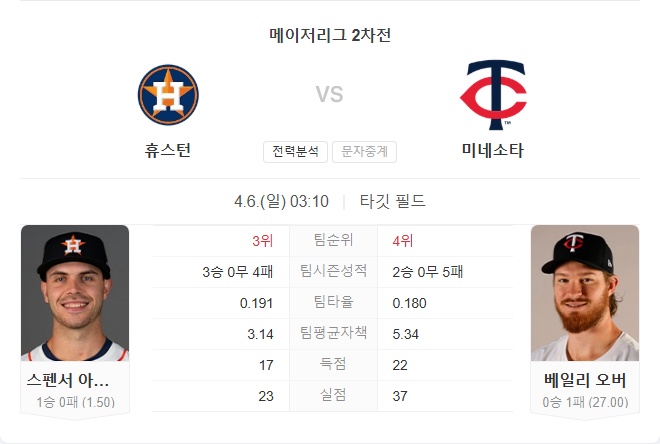 양 팀 모두 시즌 초반 들쑥날쑥한 경기력을 보이고 있으나, 선발 맞대결에서는 휴스턴이 근소한 우위를 점합니다. 아리게티는 지난 경기에서 안정된 제구와 위기관리 능력을 보여주며 기대감을 높였고, 반면 오버는 첫 등판에서 크게 무너지며 불안한 모습을 보였습니다.